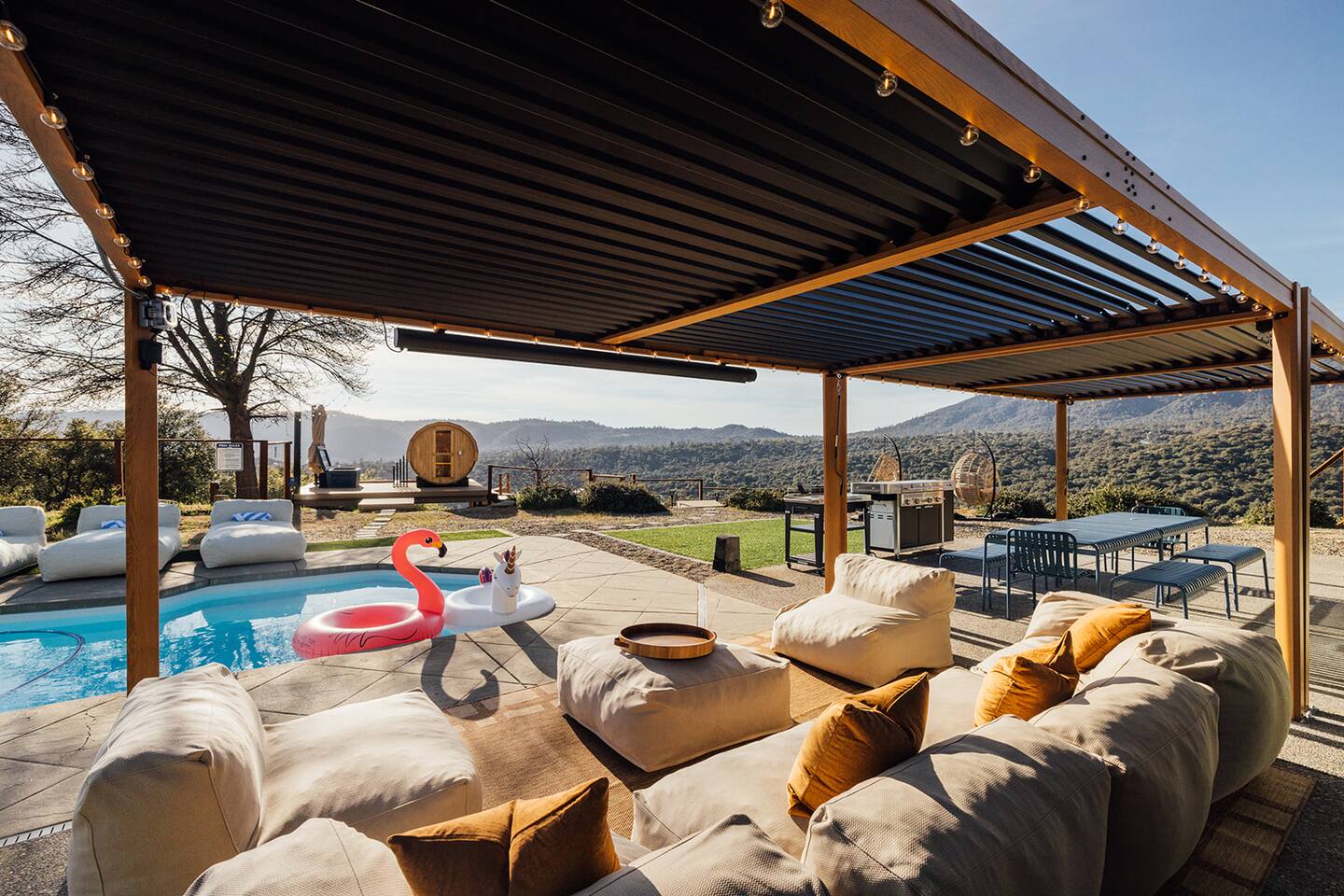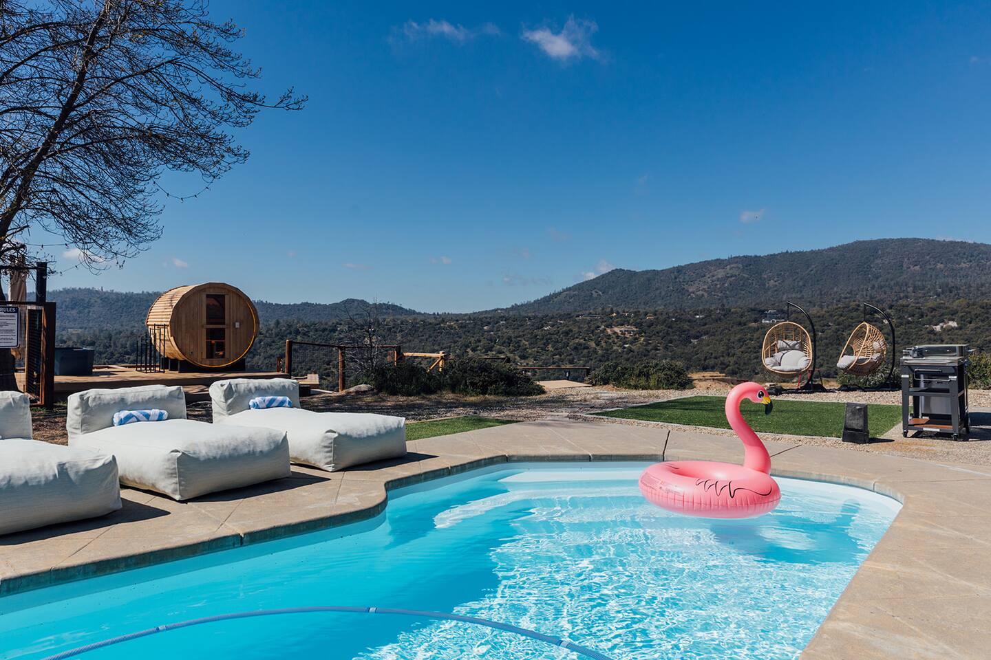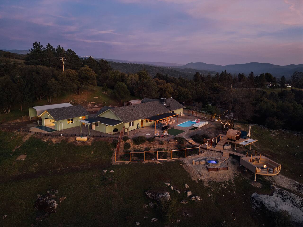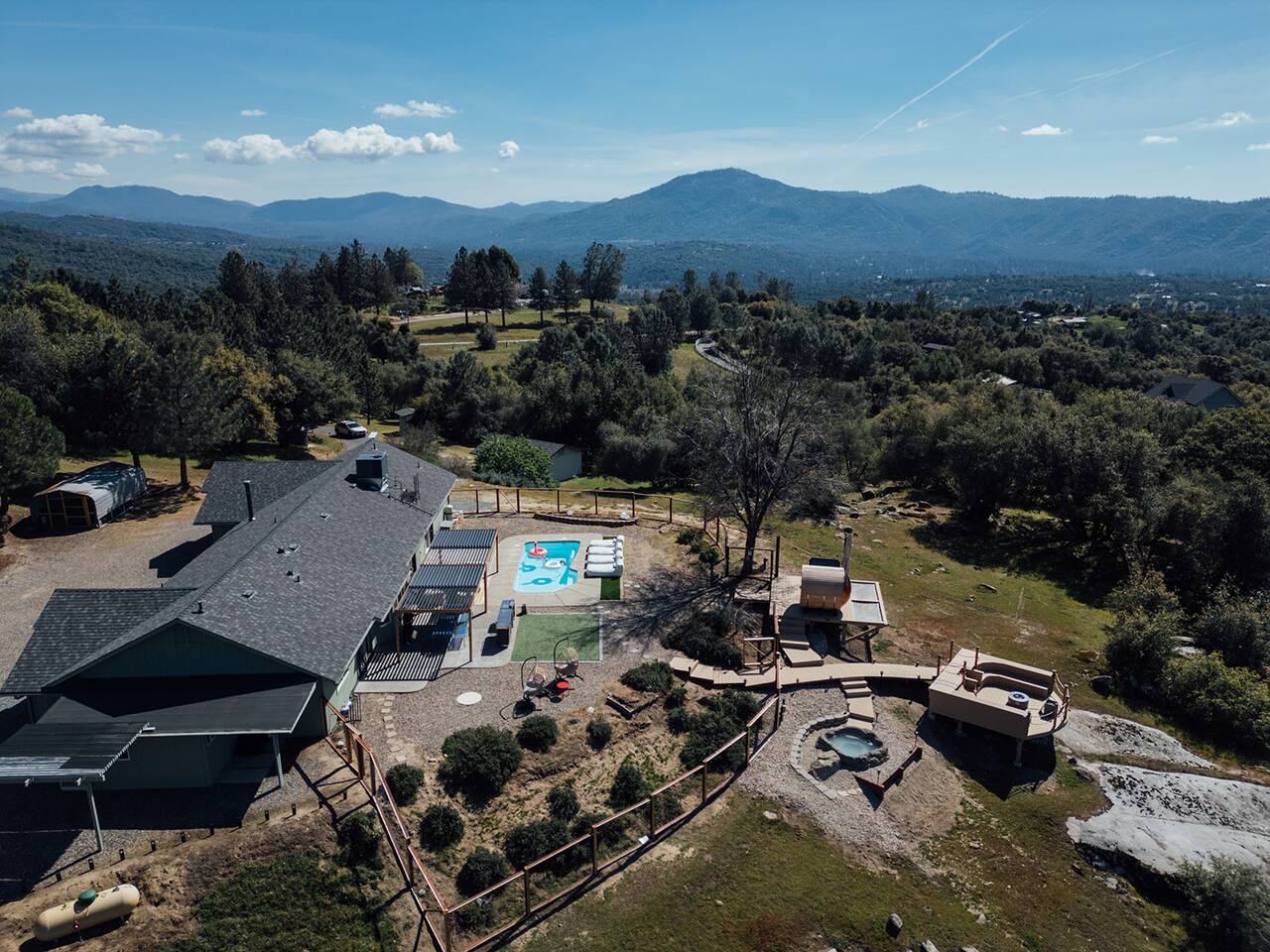 Experience quiet luxury, connection, and rejuvenation with the people who matter most. 🌙 ~38 min to Yosemite South Entrance | ~25 min to Bass Lake & Mariposa 🌙 3,000 sqft | 3.5-acre mountaintop wellness haven with views that envelop your soul 🌙 Pool + outdoor movie nights — laughter and starlit memories await 🌙 Earth Spa inspired by natural hot springs — a soak you won’t forget 🌙 Nordic Ritual — Barrel sauna, cold plunge, outdoor shower for total reset 🌙 Floating hammocks — drift atop the mountains like you’re on a cloud 🌙 Sunken fire pit deck — the ultimate gathering spot under the stars and the moon 🌙 Private gym opens to the outdoors — fresh air, sweeping views, mountain energy 🌙 Outdoor kitchen with grill, griddle, pizza stone — cook, savor, and make meals an experience 🌙 Astronomy binoculars — nights here deserve more than just a glance 🌙 Modern wood stove — cozy fireside chats on chilly nights 🌙 Stocked Nespresso bar — slow mornings, rich lattes, mountain calm in every sip 🌙 5 bedrooms | 6 king beds with hotel-quality linens — every sleep feels like a getaway 🌙 Japandi elegance meets Mid-Century Modern charm — warm, cozy, quietly cinematic ✨ Every detail here was intentionally curated to create more than a stay — a place where wellness turns into genuine happiness.